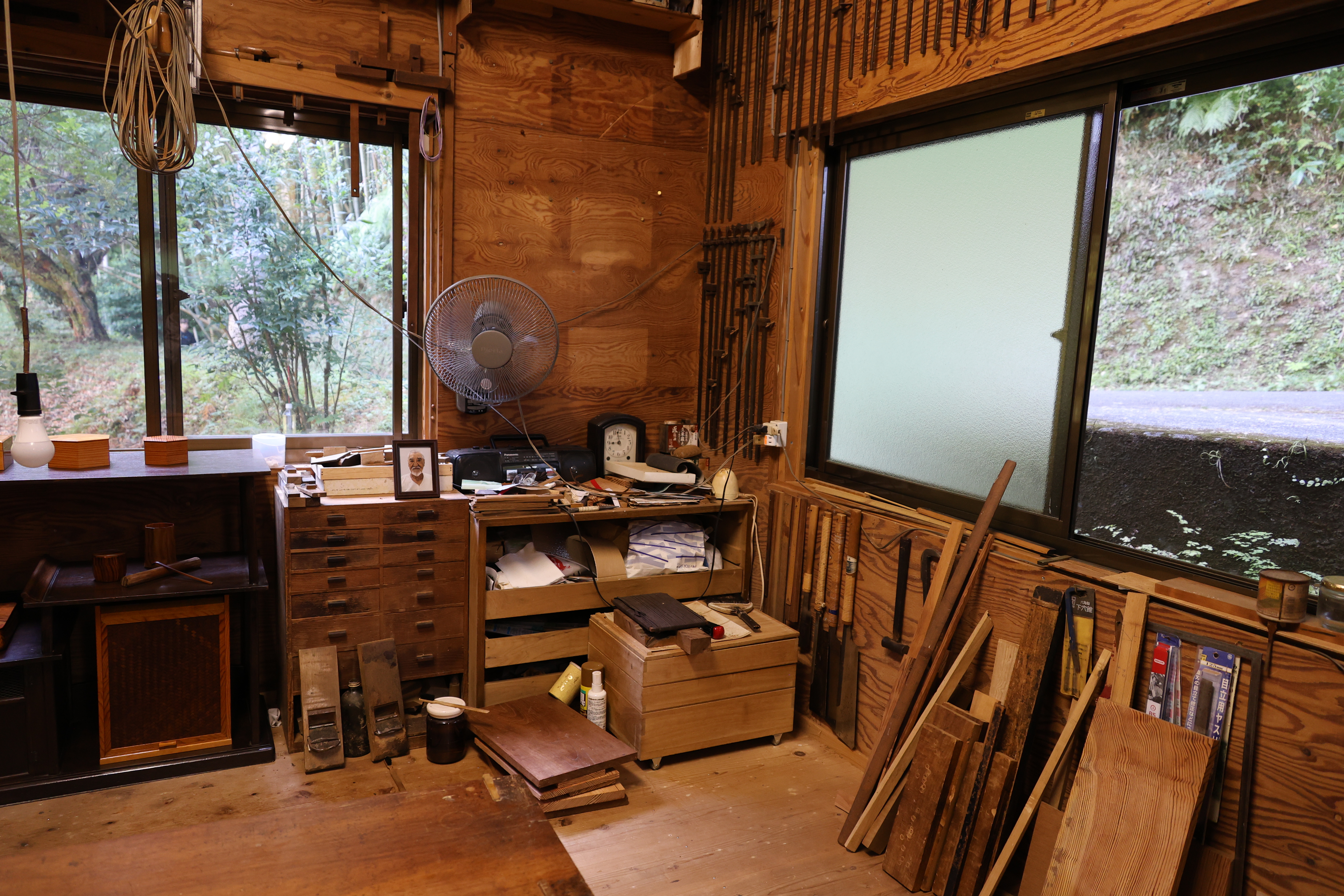 撮影場所として実際の工房を貸してくださった下田脂松細工職人の嶋崎さん